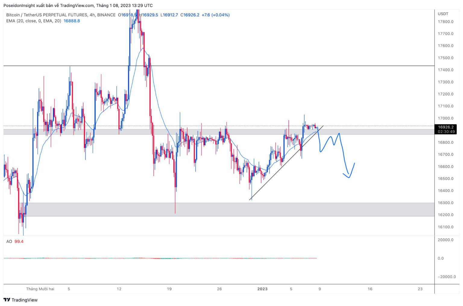 Deciding on a trade is challenging in the current market conditions. The 4-hour BTC chart appears to be forming an uptrend and has broken through resistance at $16,800, respecting this price level. However, the latest candlestick formations are quite frustrating (sideways). Therefore, I will avoid taking a long position and will wait for a short setup if the price breaks the trendline and forms a double-top pattern.