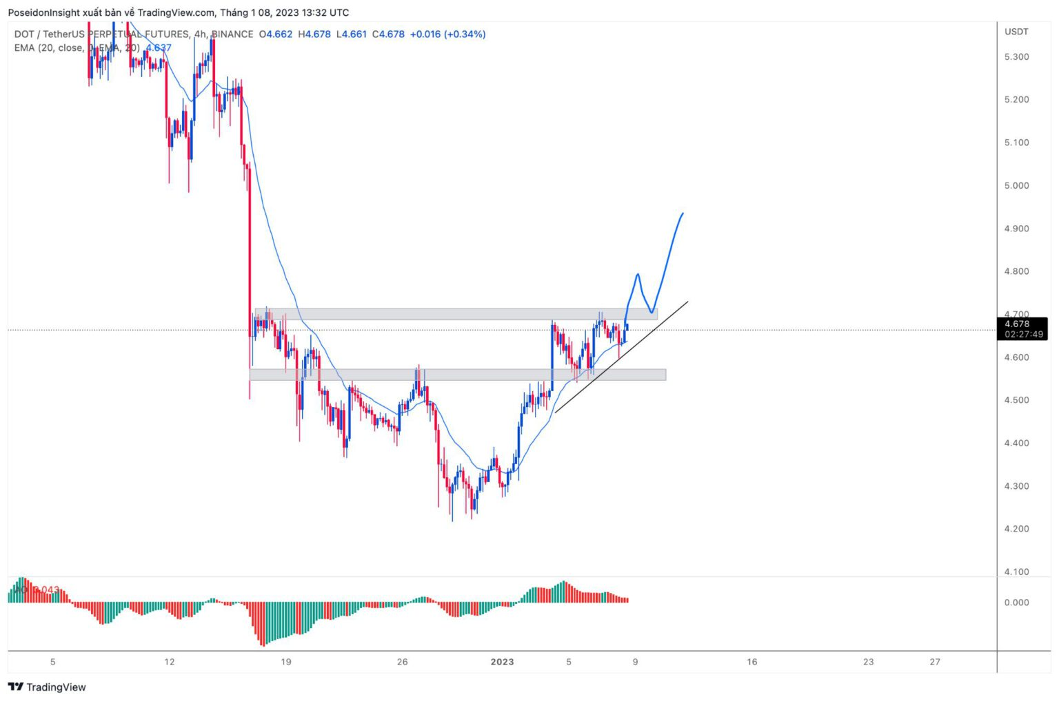 DOT on the 4-hour chart is forming a bullish flag pattern. You can set up a long trade if the price breaks through resistance at $4.70 (ensure strong buying pressure), and then monitor for a potential entry.