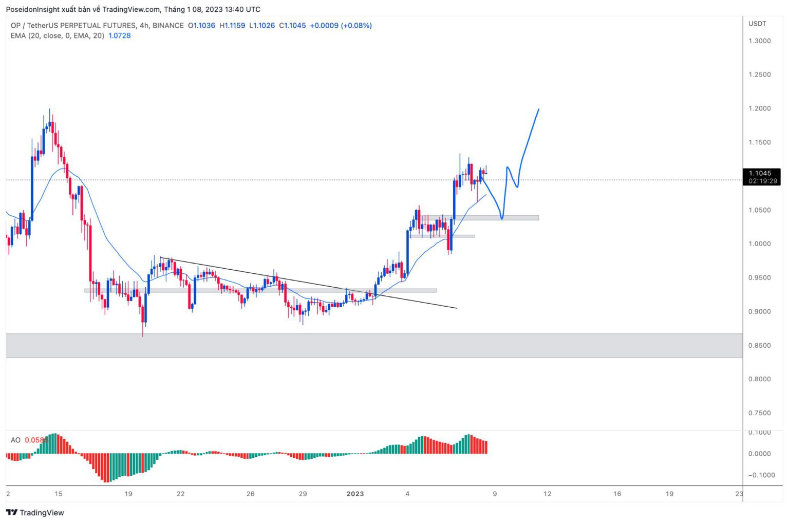 OP has shown a strong uptrend on the 4-hour chart. Consider waiting for a pullback to the $1.03 support level, then enter a trade on the 15-minute or 1-hour chart with a solid candlestick setup.