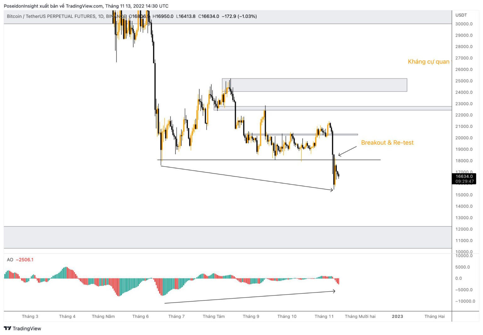 It seems like the market has broken out of the sideways price range following continuous negative news related to the FTX collapse and the ongoing impact of the FED's rate hikes.