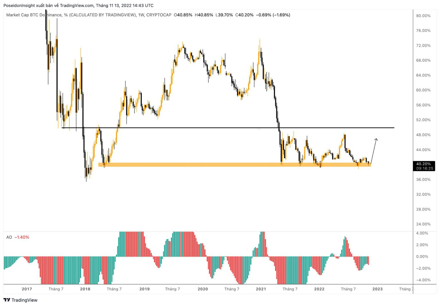 BTC Dominance Chart, screenshot from TradingView as of 11/13/2022
