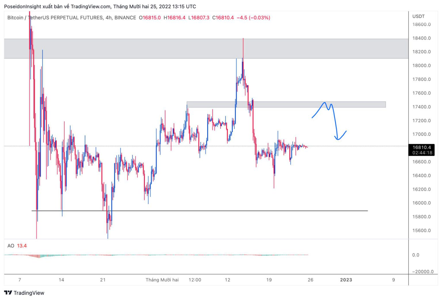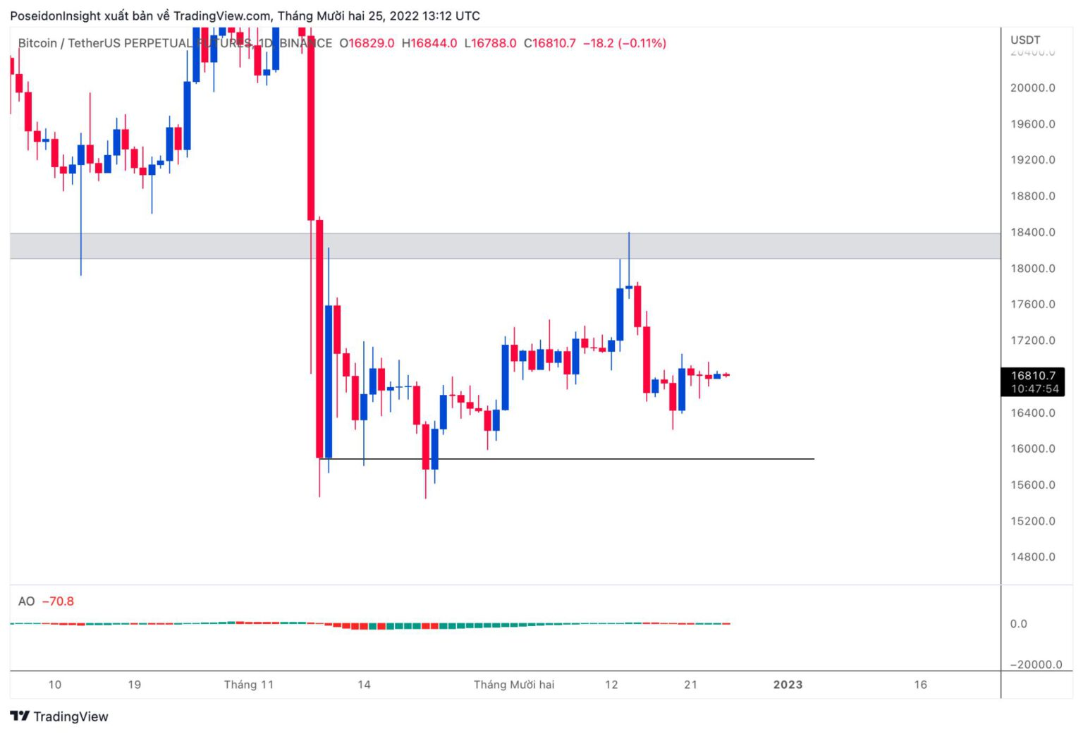 The weekly chart remains dull. With this week’s green candle likely closing at $16,800, the price is showing indecision. Combined with last week’s candle, we observe balanced selling and buying pressure, keeping BTC within a range of $15,900 – $18,000. Given the holiday season in many countries, significant price movements are unlikely. Patience will be crucial for those looking to trade in the coming weeks.