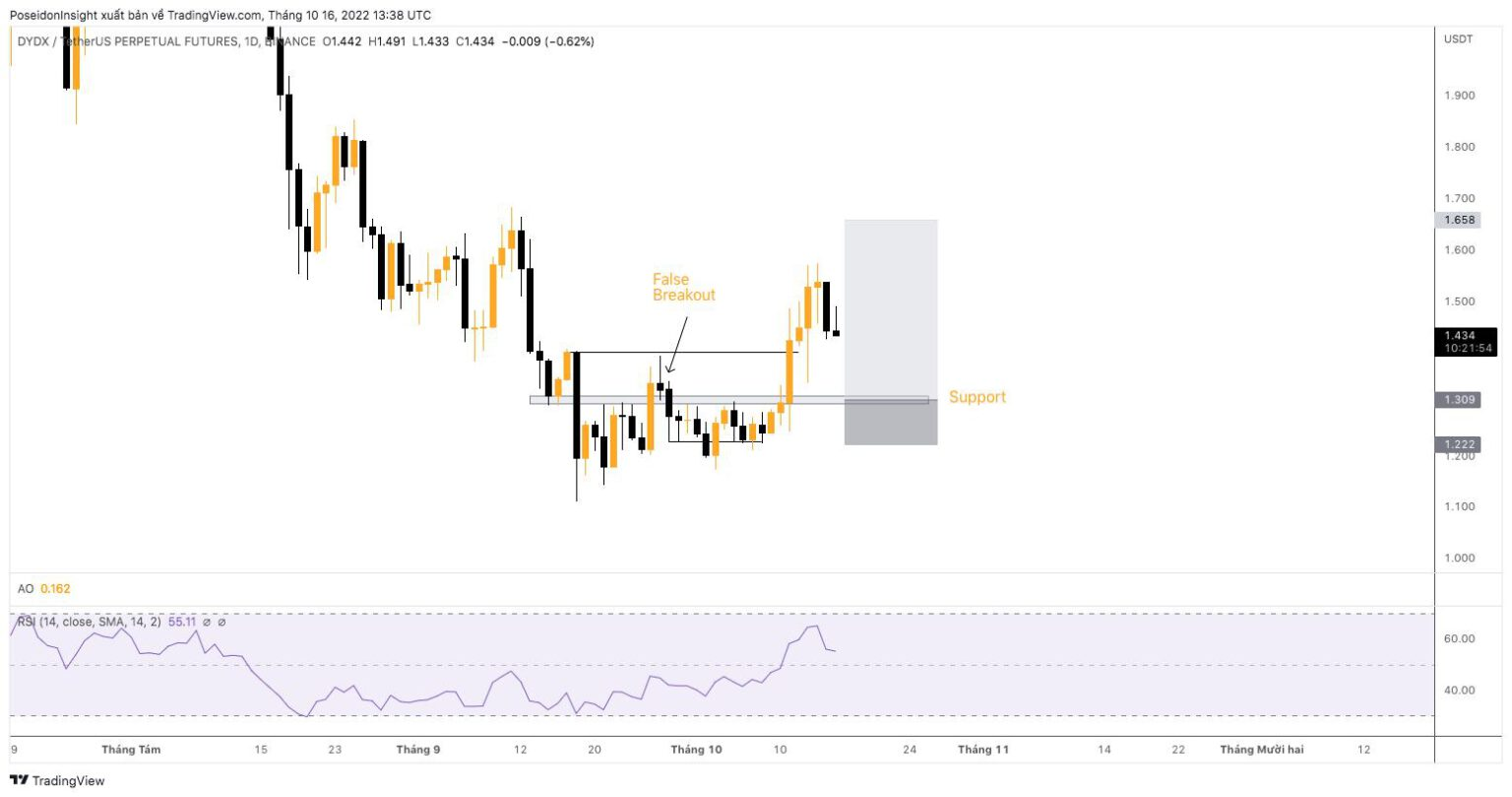 DYDX experienced a bull run on the daily chart and is currently undergoing a correction. The price level at 1.311 previously acted as resistance with a false breakout, so I expect the price to test this level again before continuing upward.