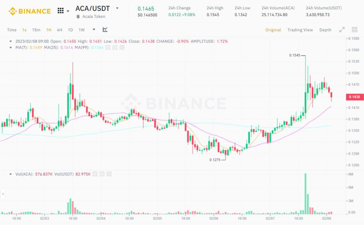 1H Chart of ACA/USDT on Binance as of 09:35 AM, February 8, 2023