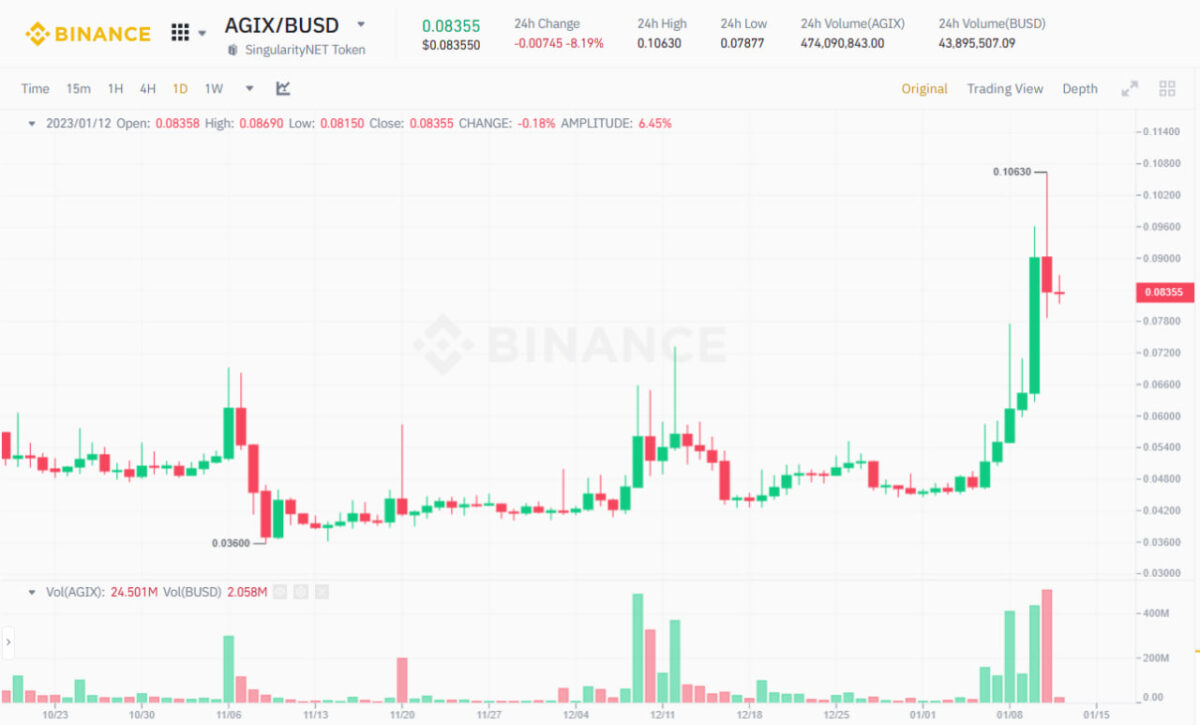 1D Chart of AGIX/BUSD on Binance as of 12:30 PM January 12, 2023