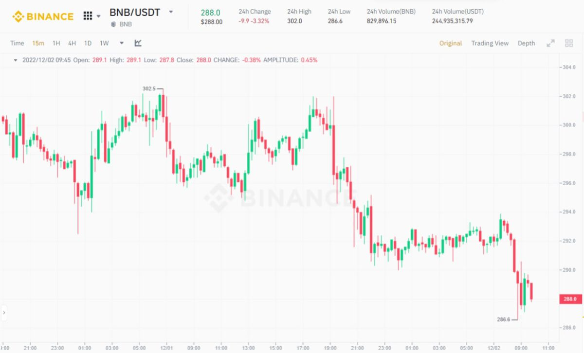 15m Chart of BNB/USDT on Binance at 10:00 AM, December 2nd, 2022