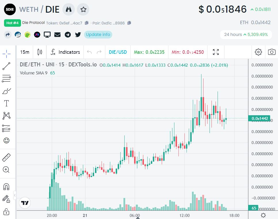 Notably, Die Protocol (DIE) saw its value surge by 5,500% within 12 hours, according to data from DEX Tools. The trading volume of this memecoin has reached approximately $23 million since its inception.