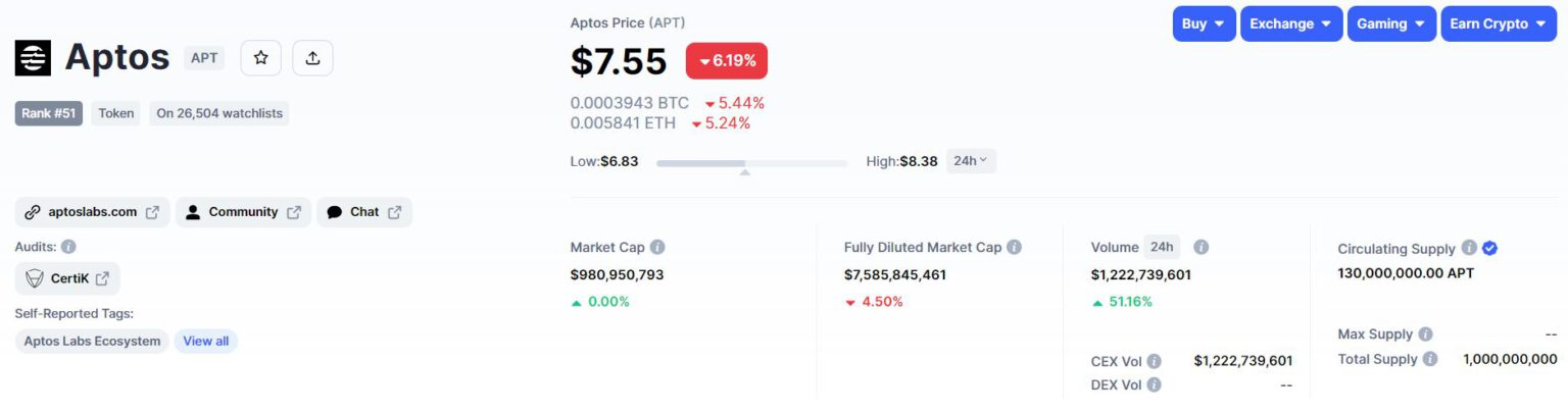With this price, Aptos’ diluted market cap stands at nearly $7.6 billion, while its market cap is $980 million. The 24-hour trading volume of APT is over $1.2 billion.