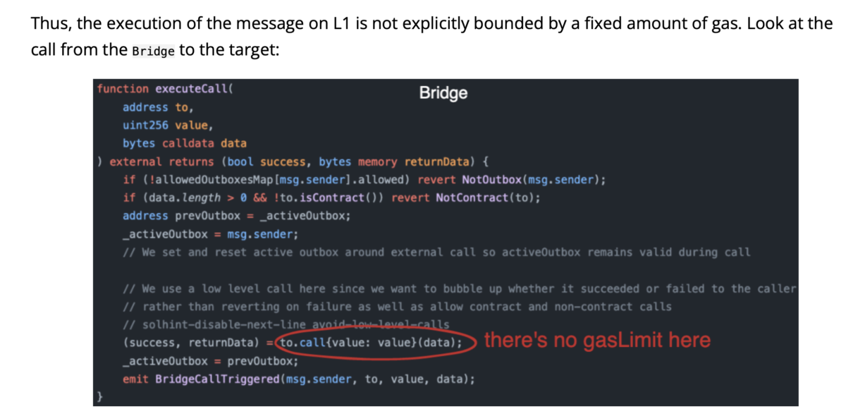 Vulnerability 1: The author argues that the function for validating the "true/false" value in the Execute Call function is exposed, allowing attackers to continuously send "false" data to create loops until their objective is achieved. The author emphasizes that data transmission from L2 to L1 can be "retryable," meaning multiple attempts are possible.