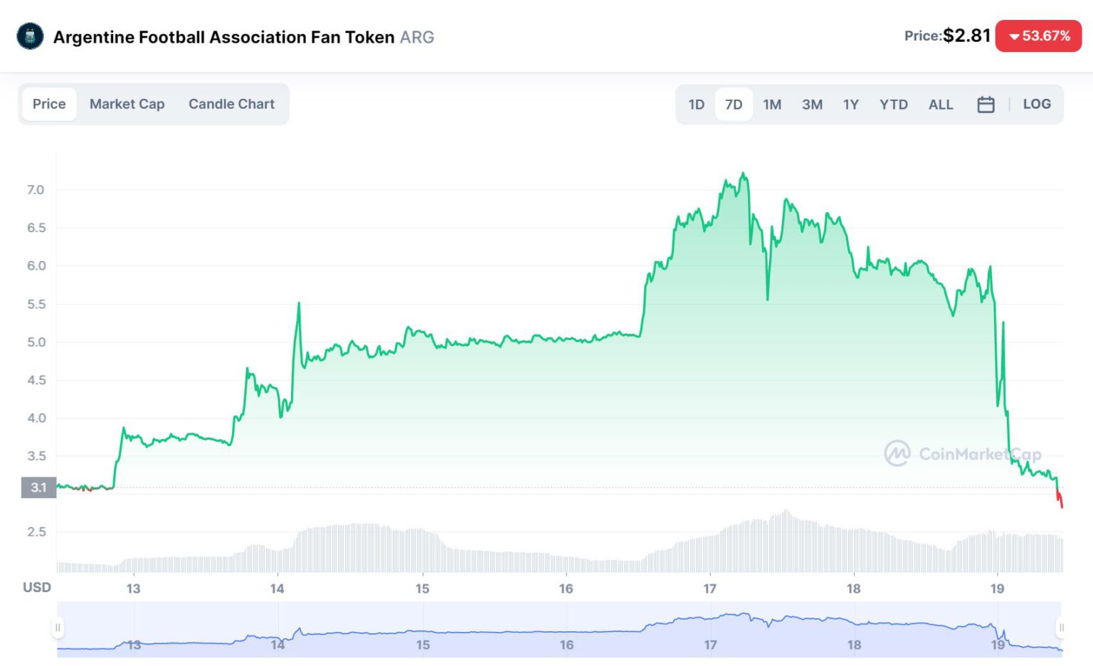 Despite the historic achievement for the South American nation, Argentina's fan token, ARG, is trending downward. From a peak of $7.20 on December 17, the value of ARG has sharply dropped to $2.76, losing 62.5% of its value.