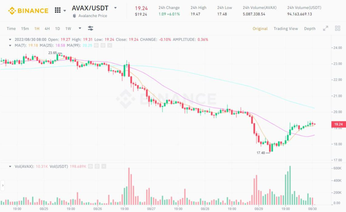 1-hour chart of the AVAX/USDT pair on Binance as of 08:10 AM on August 30, 2022