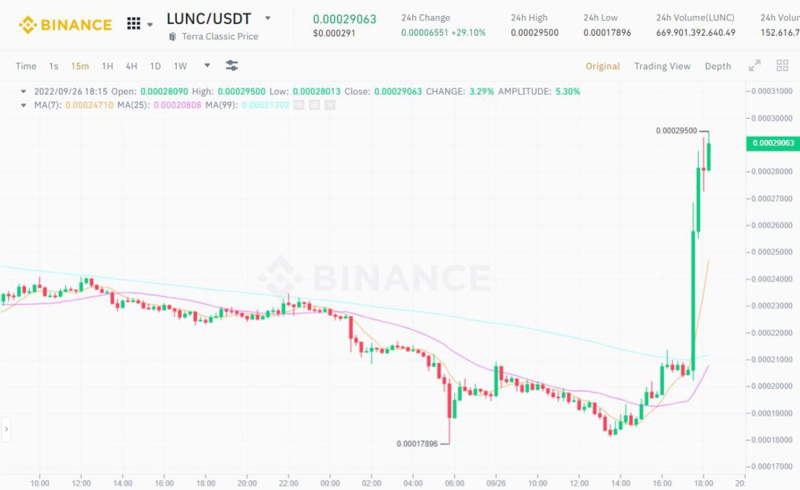 15-minute chart of LUNC/USDT on Binance as of 5:20 PM, September 26, 2022