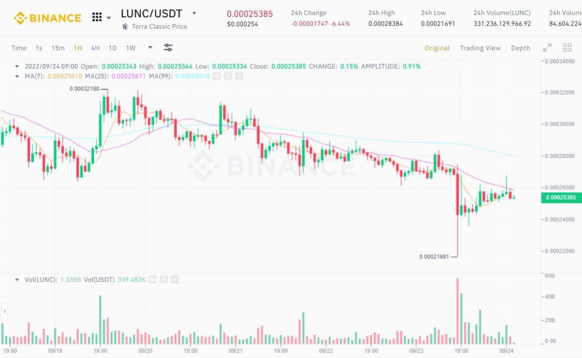 1H LUNC/USDT Price Chart on Binance at 9:20 AM, September 24, 2022