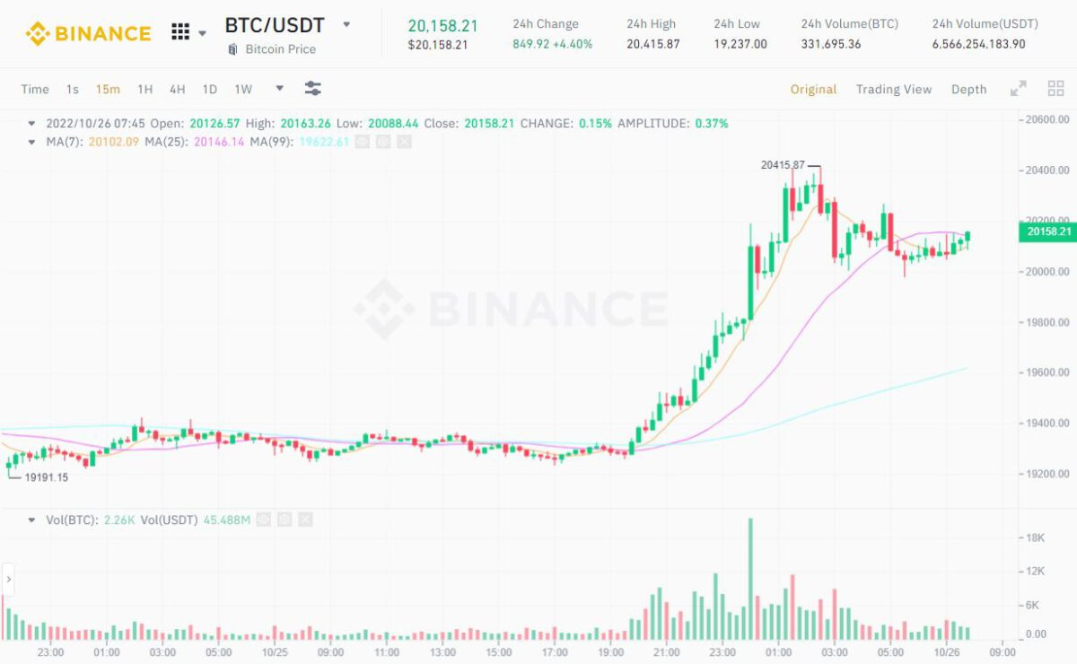 Bitcoin (BTC) jumped from $19,237 to as high as $20,415 – its highest level since October 4 – before pulling back to around $20,100 at the time of writing.