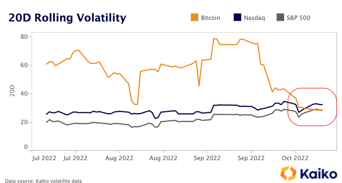 According to cryptocurrency data analysis firm Kaiko, the 20-day average volatility of Bitcoin (BTC) has recently dropped below that of Nasdaq and S&P 500, two of the leading U.S. stock indices.