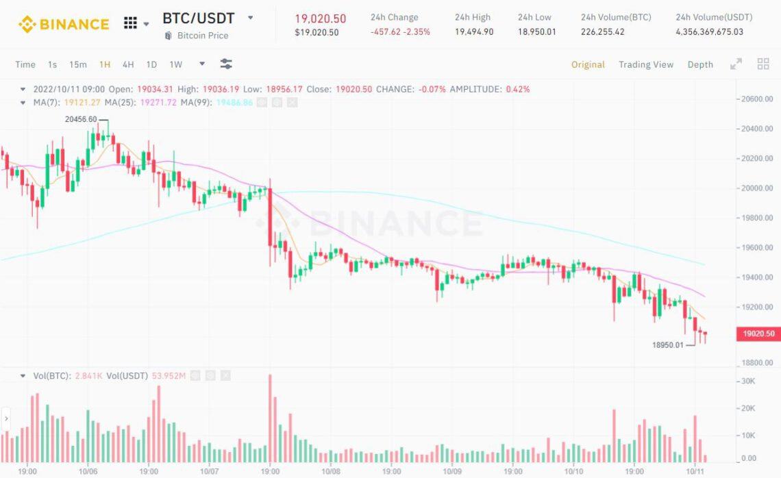 1H Chart of BTC/USDT on Binance as of 09:20 AM on October 11, 2022