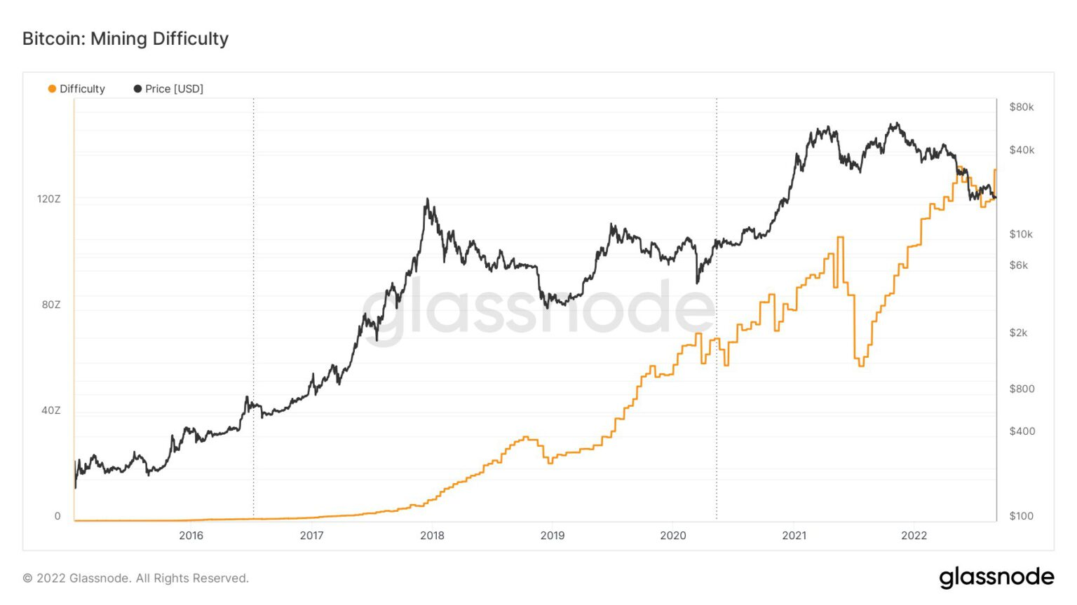 Bitcoin Mining Difficulty (Yellow) and BTC Price (Black). Source: Glassnode