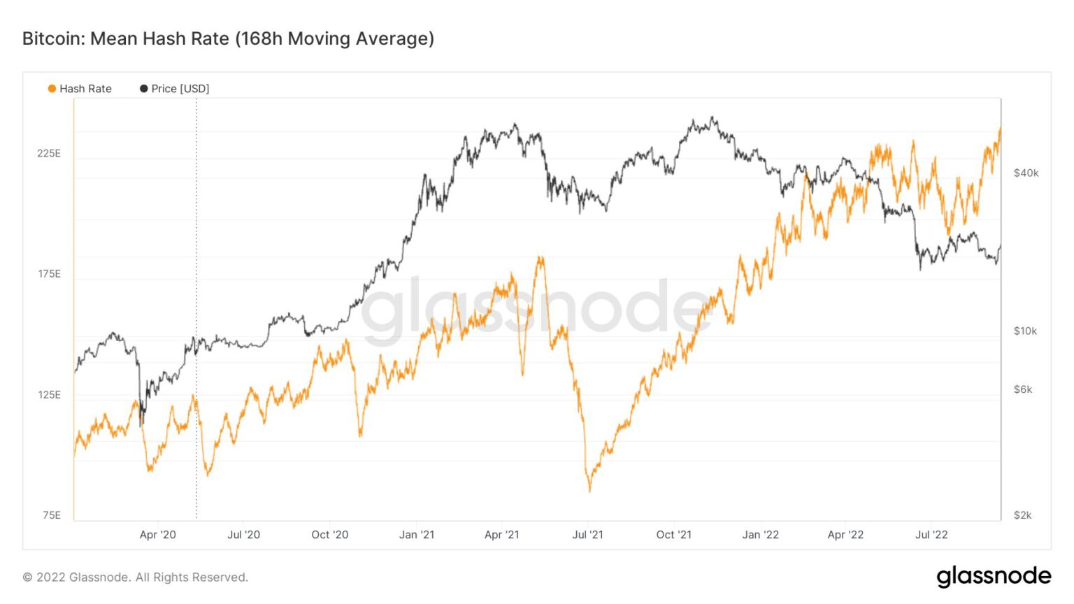 Bitcoin Network Hash Rate (Yellow) and BTC Price (Black). Source: Glassnode