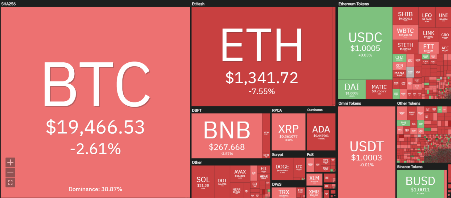At the time of writing, BTC is struggling to counteract the strong sell pressure and is trading around $19,403.