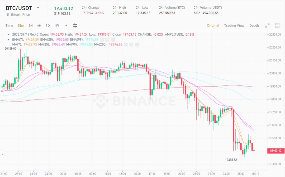 After experiencing a series of “rollercoaster” movements over the past two weeks—rising sharply before the US CPI announcement, then dipping below $20,000 during The Merge, and briefly recovering to around $20,100 over the weekend—Bitcoin suddenly fell to $19,300 in the early hours of September 19. This drop triggered a significant sell-off across the altcoin market, with many assets experiencing double-digit losses.