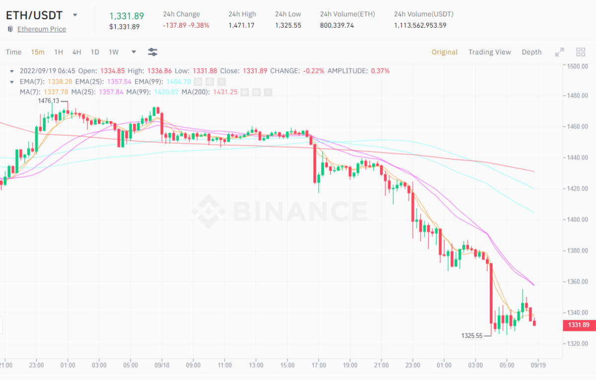 The second-largest cryptocurrency, Ethereum, has also seen a severe drop, losing nearly 10% over the past 24 hours and still struggling to recover from the The Merge incident. Ethereum is currently trading at $1,331.89
