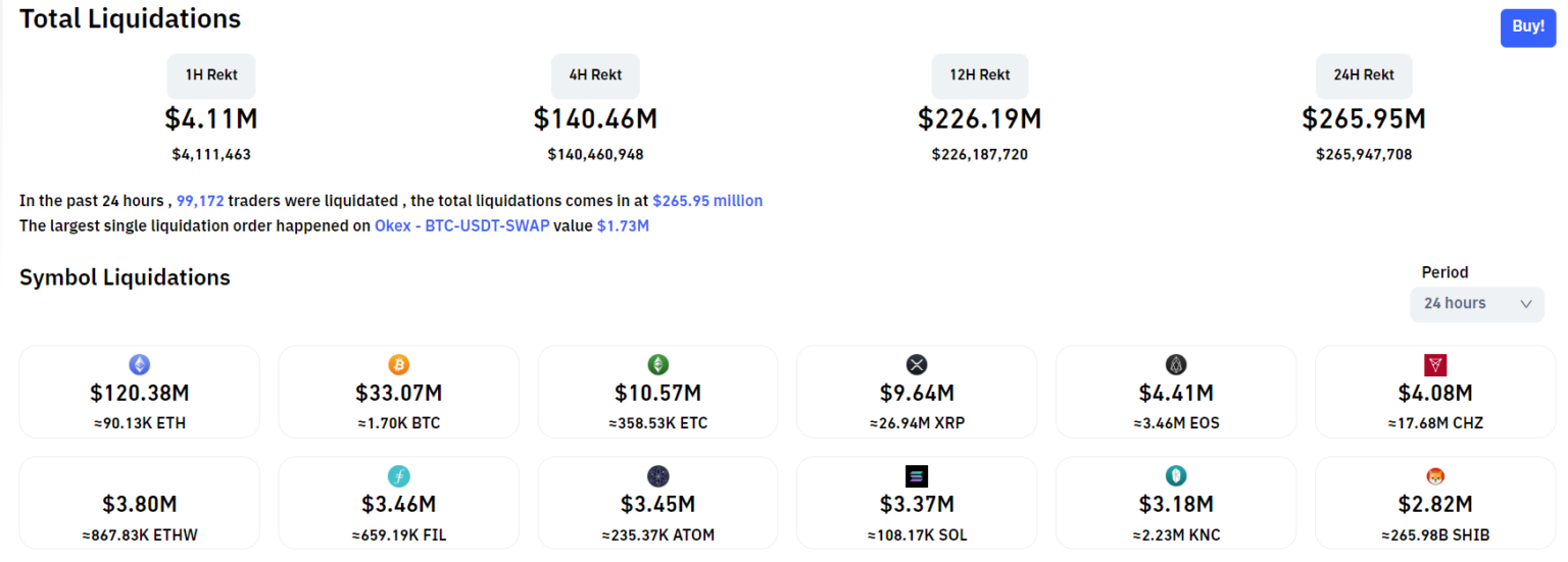 Over the past 24 hours, $265.95 million worth of cryptocurrency positions were liquidated, with nearly 90% being long positions. Ethereum led the liquidations with $120.38 million, followed by Bitcoin at $33.07 million.