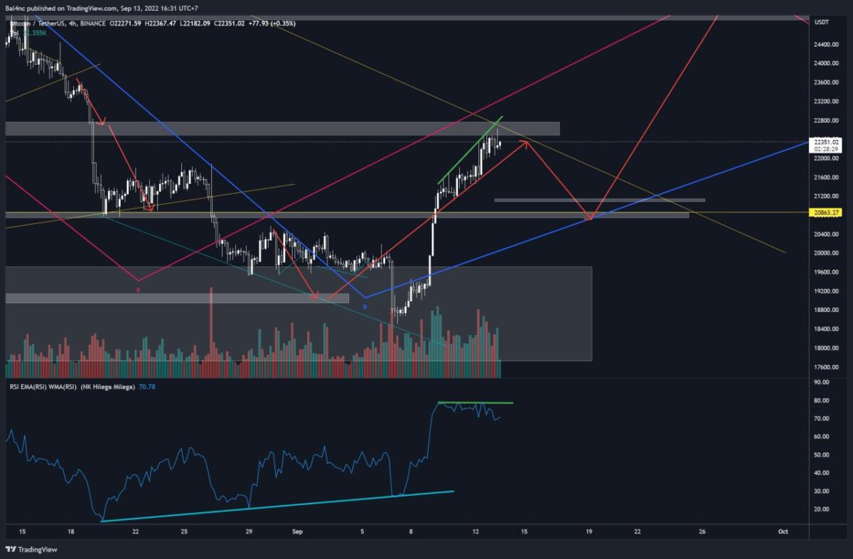 In this timeframe, BTC is still trending upwards but at a slower pace, and it may continue to consolidate between $22,200 and $22,700 before a potential decline.