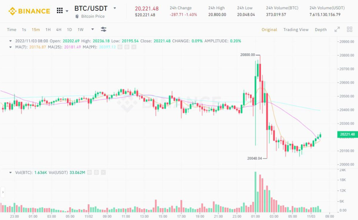 15-minute Chart of BTC/USDT on Binance at 08:10 AM on 03/11/2022