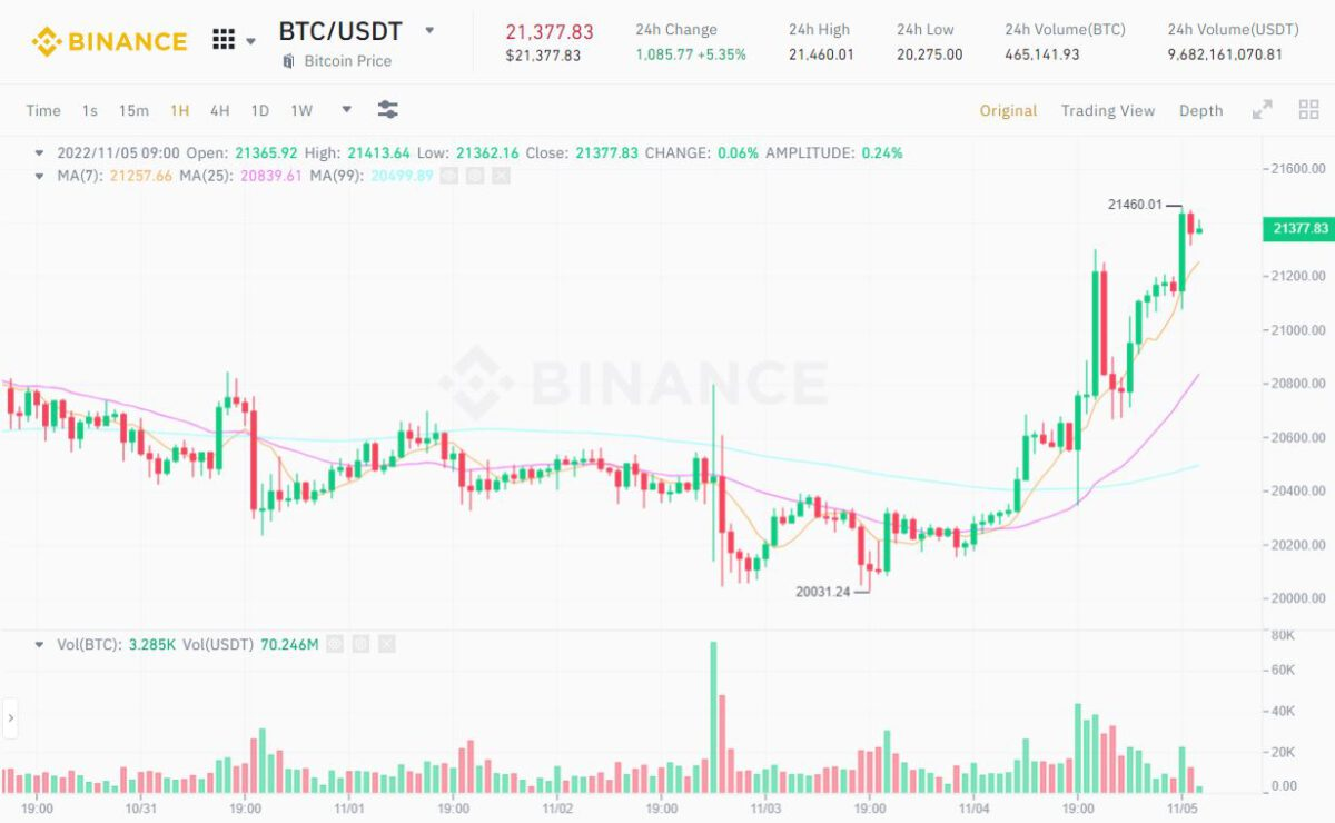 As of the morning of November 5, Bitcoin (BTC) has surged to a peak of $21,460, marking an increase of nearly 5.5% from 24 hours prior. This is also the highest price point for the world’s largest cryptocurrency since mid-September.