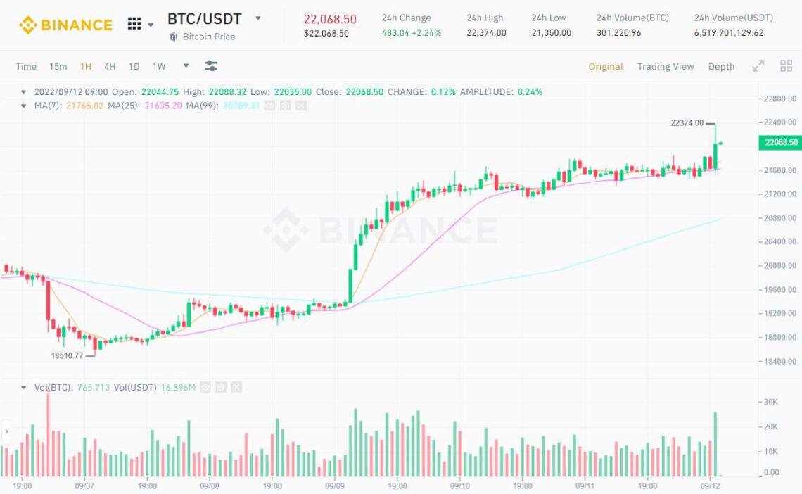 Following a recovery since hitting a two-month low of $18,649 on September 6th, Bitcoin reached a new peak of $22,374 on Monday morning (September 12th). This marks the highest value BTC has achieved since mid-August.
