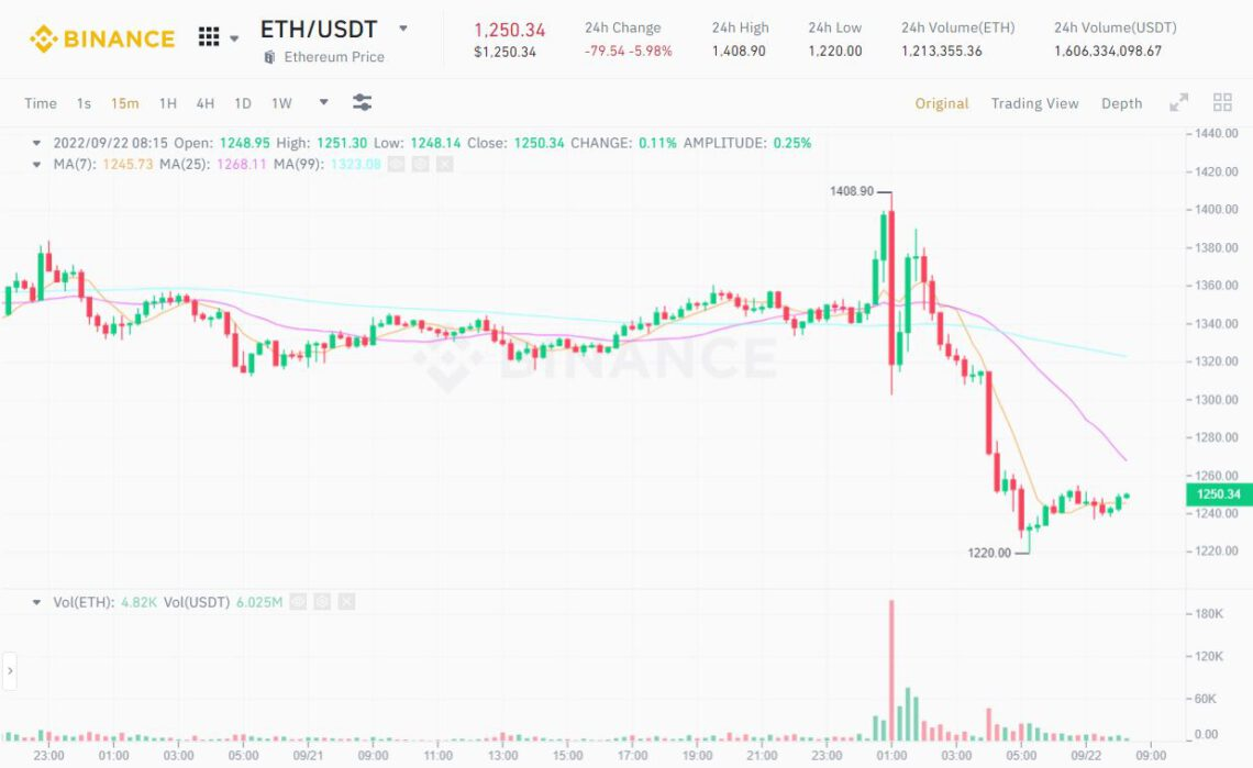 15-minute Chart of ETH/USDT on Binance at 08:25 AM on September 22, 2022