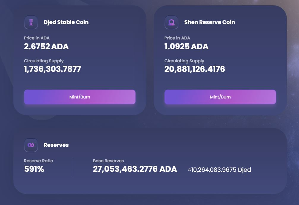 As initially planned, Djed is pegged 1:1 to the USD, over-collateralized with ADA (similar to DAI), and uses SHEN as its reserve currency. DJED is backed by ADA with a reserve ratio of 400-800% to minimize the risk of deviating from its value peg.