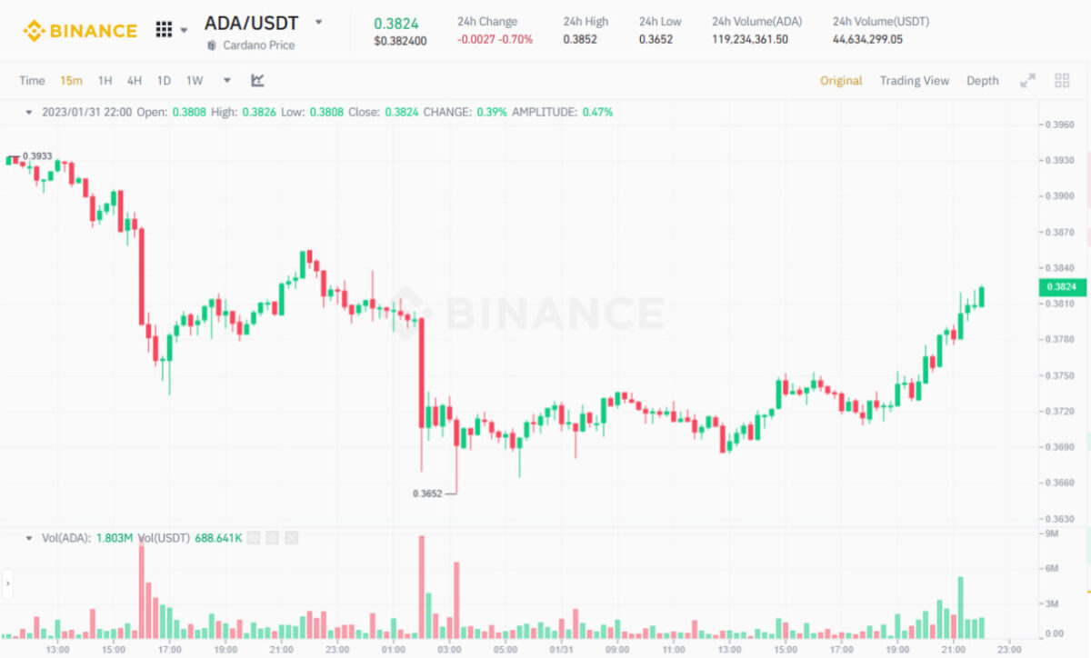 15m Chart of ADA/USDT on Binance as of 10:05 PM on January 31, 2023