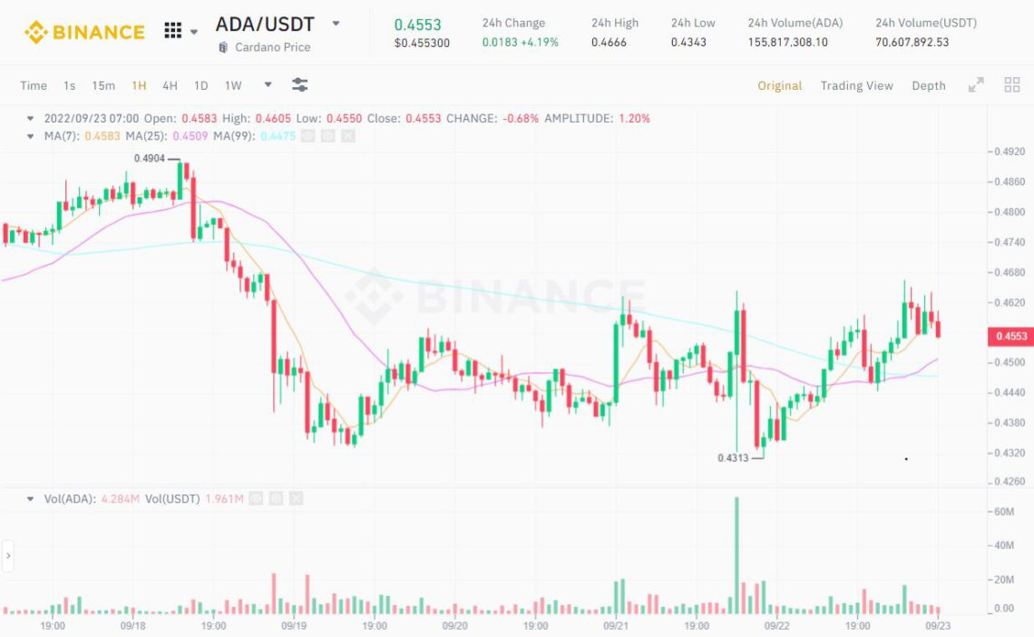 1H Chart of ADA/USDT on Binance as of 07:50 AM, September 23, 2022