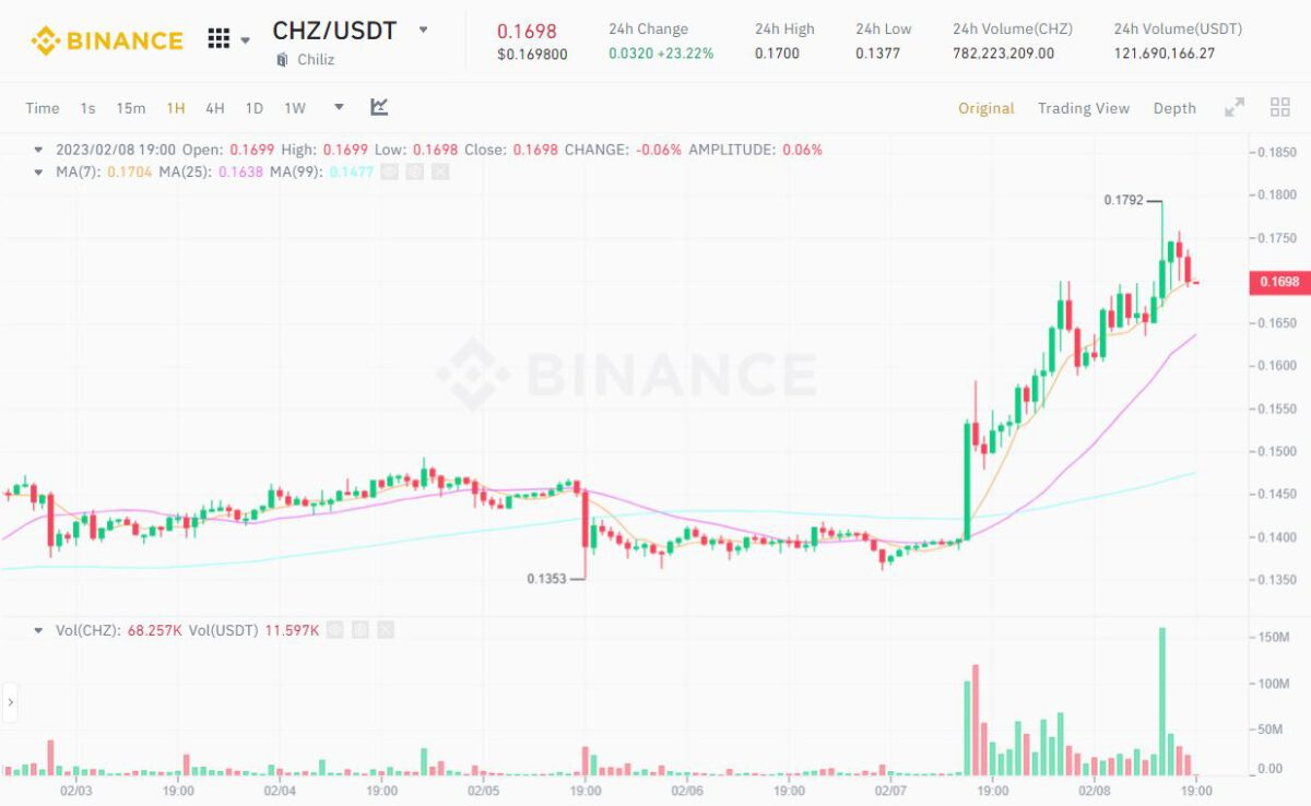 1-hour CHZ/USDT Chart on Binance as of 07:00 PM, February 8, 2023
