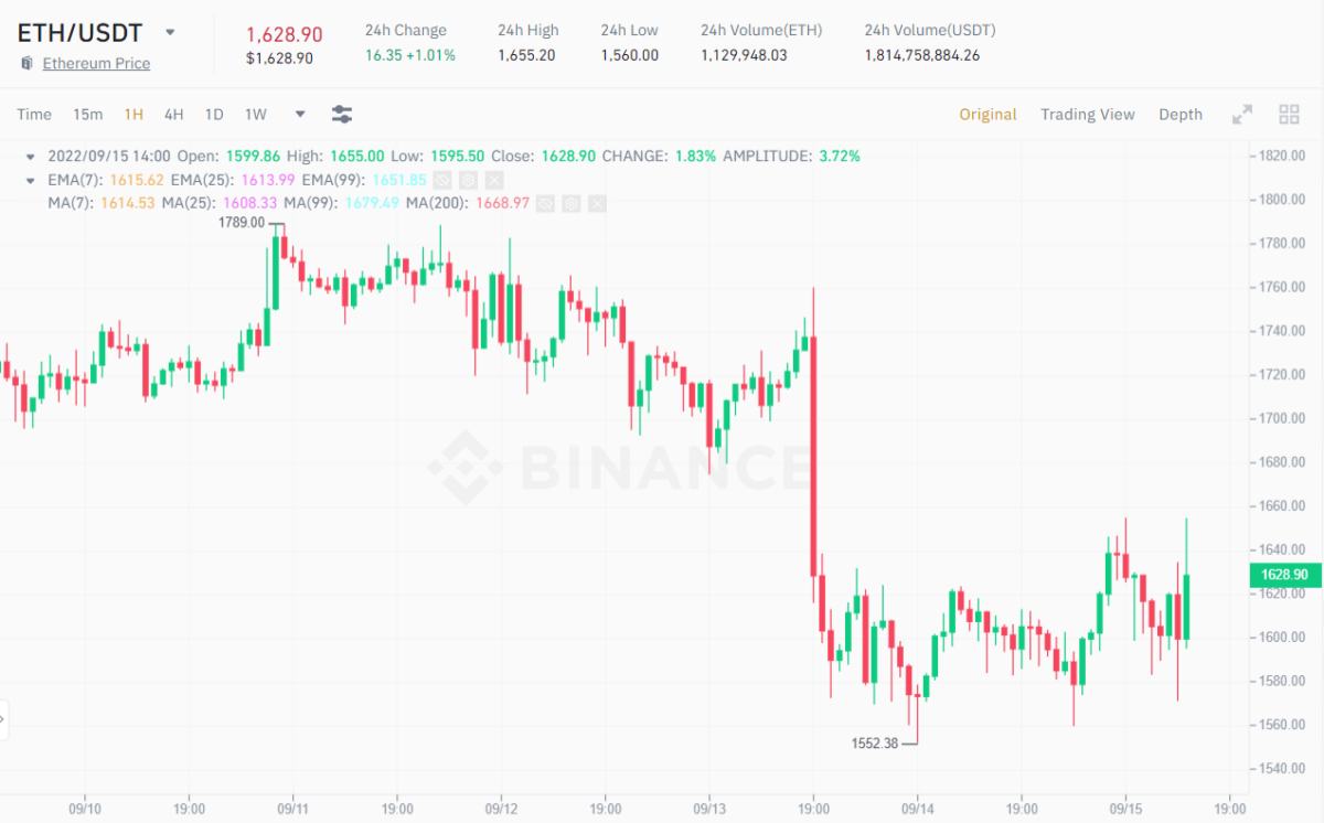 1H ETH/USDT Chart on Binance at 2:40 PM on September 15, 2022. Source: Binance
