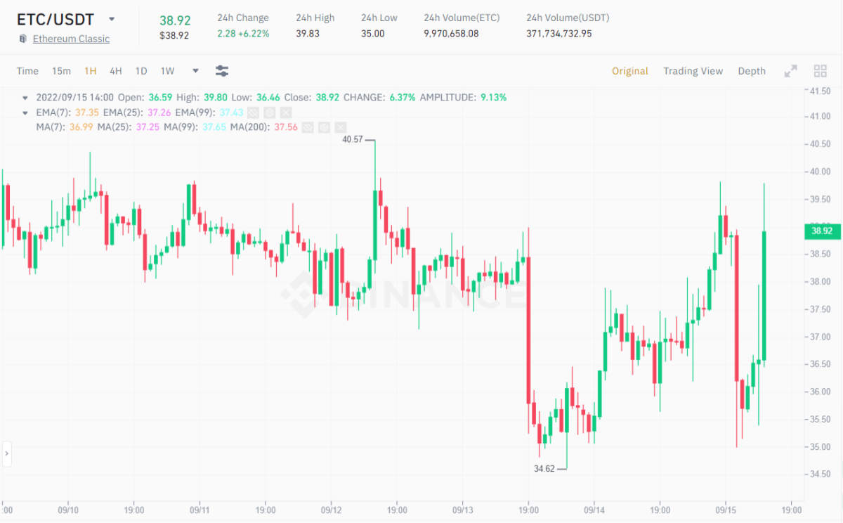 1H ETC/USDT Chart on Binance at 2:40 PM on September 15, 2022. Source: Binance