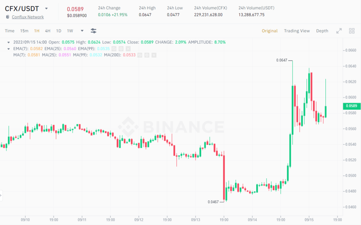 1H CFX/USDT Chart on Binance at 2:40 PM on September 15, 2022. Source: Binance