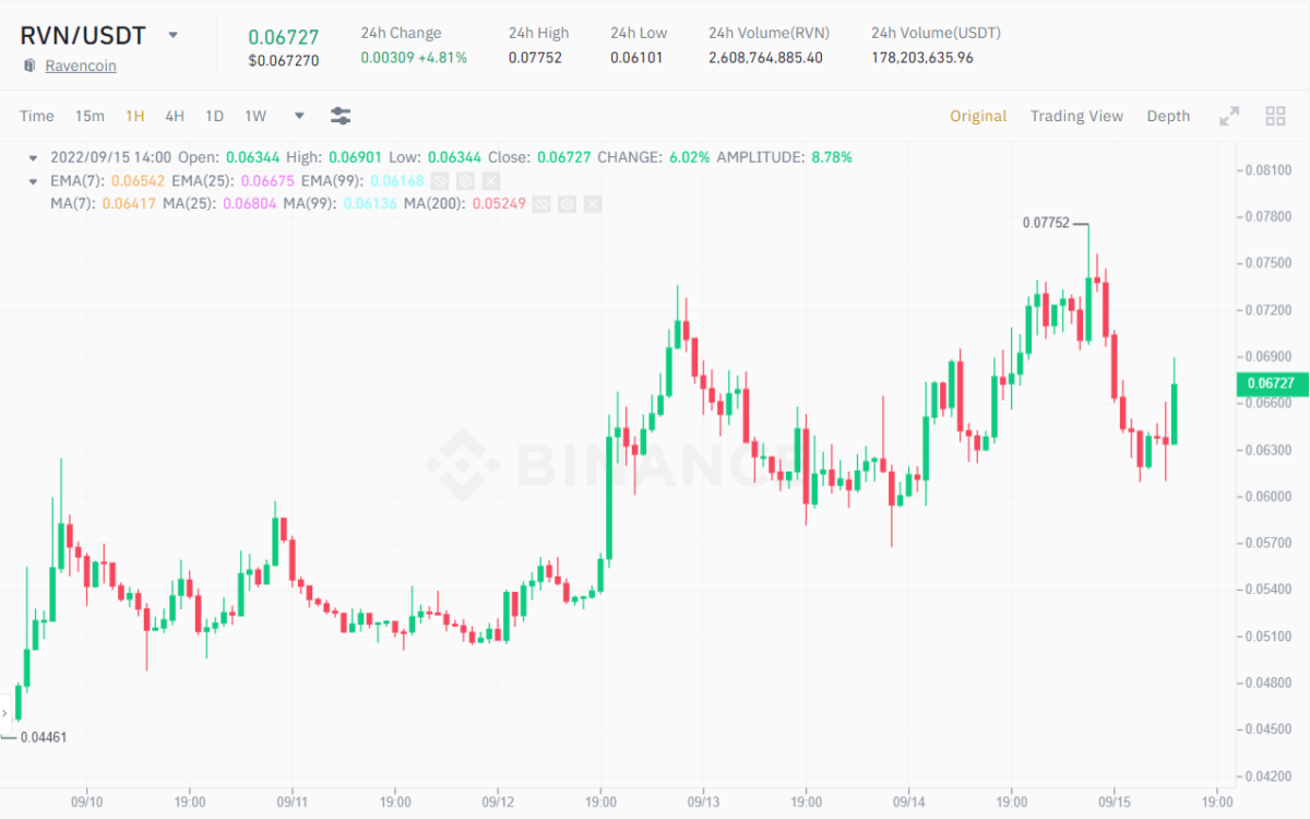 1H RVN/USDT Chart on Binance at 2:40 PM on September 15, 2022. Source: Binance