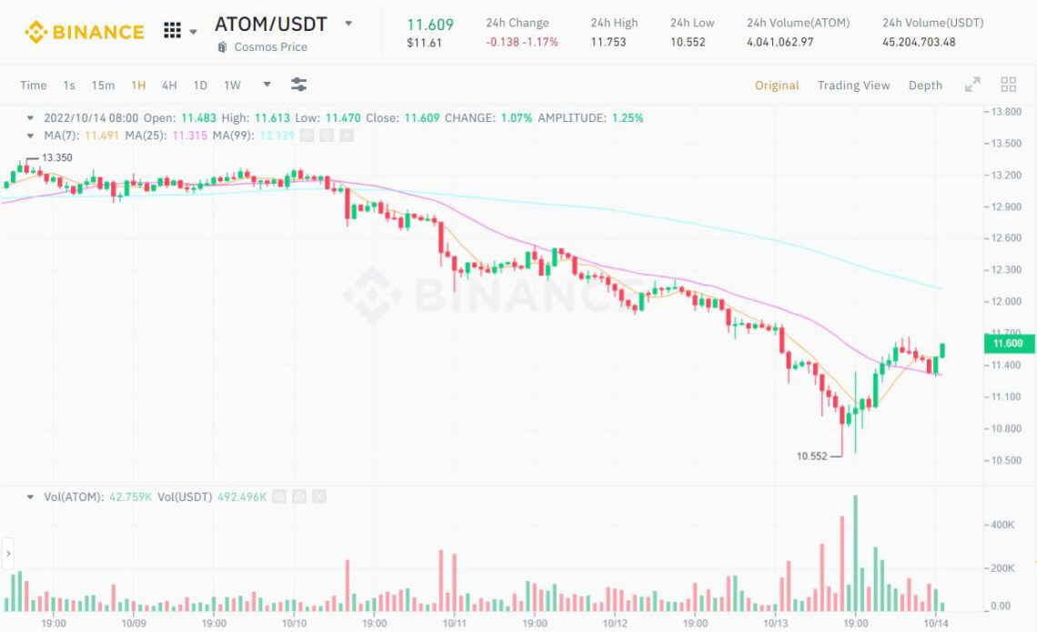 1-hour ATOM/USDT Chart on Binance at 08:25 PM on October 14, 2022