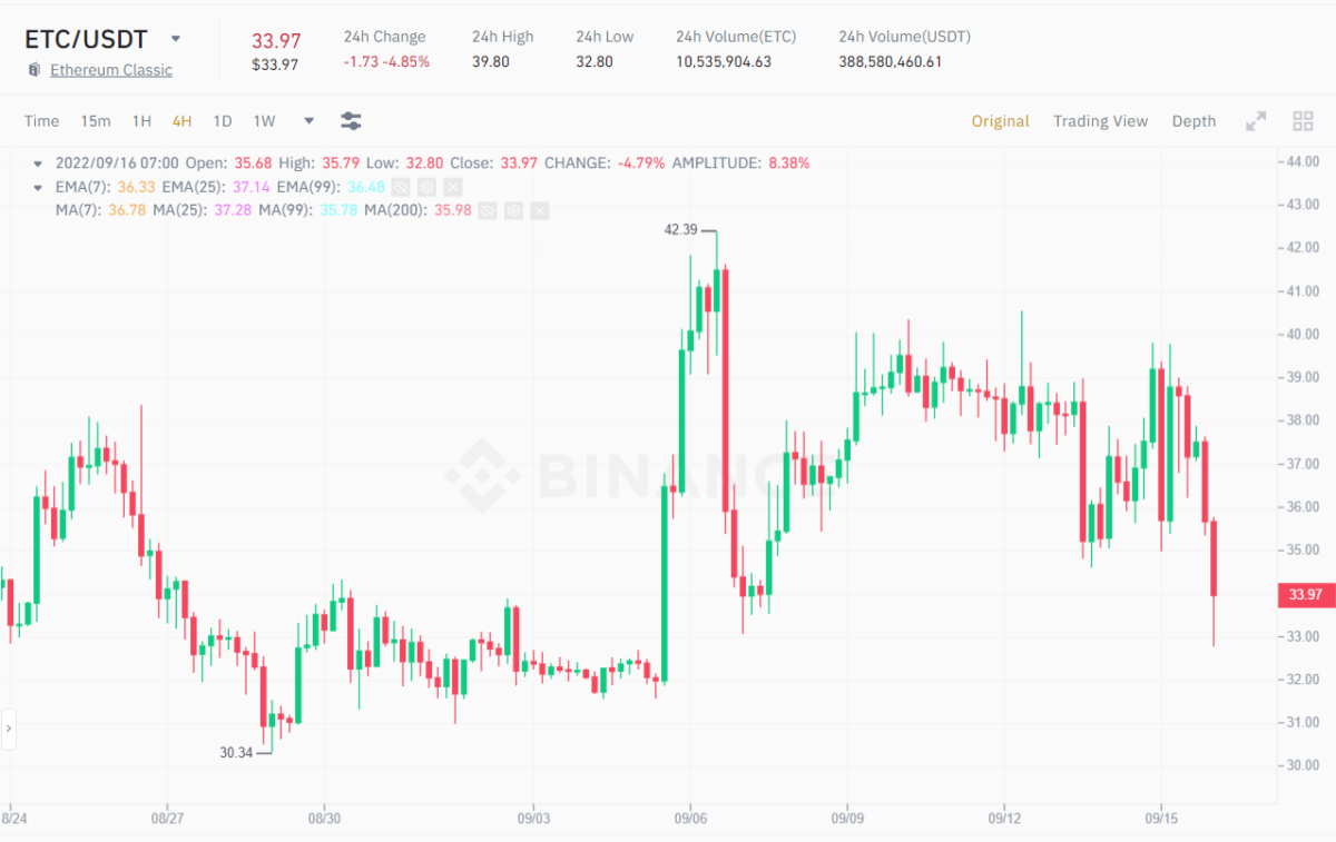 4H Chart of ETC/USDT as of 11:54 AM, September 16, 2022. Source: Binance
