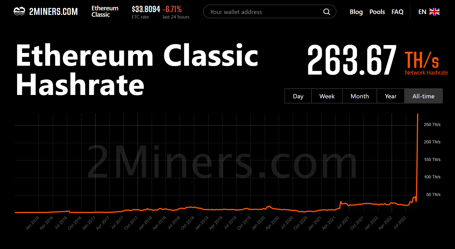 The largest and most well-known Ethereum fork is Ethereum Classic (ETC), which currently boasts a hashrate of 263.67 TH/s, the highest in ETC’s history.