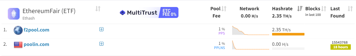 Hashrate of EthereumFair (ETF) as of 11:54 AM, September 16, 2022. Source: Mining Pool Stats