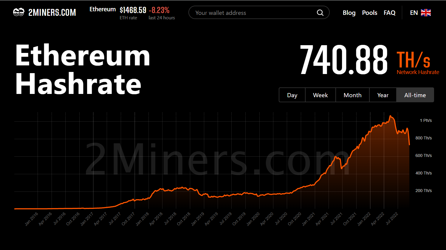 Before Ethereum successfully completed The Merge and fully transitioned away from mining, ETH’s hashrate was at 740.88 TH/s.