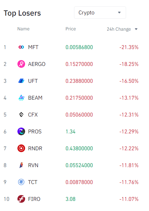 Top Gainers and Losers on Binance in the Past 24 Hours. Source: Binance