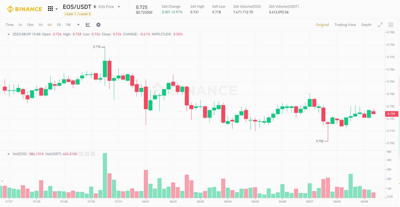 Chart 4h of EOS/USDT pair on Binance at 06:40 PM on 09/08/2023