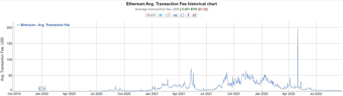 High Ethereum transaction fees have always been a hot topic in the crypto community. However, compared to the peak in May 2021, ETH gas fees have significantly decreased. According to BitInfoCharts, the current gas fee on Ethereum hovers around 0.001 ETH, roughly $1.32 – the lowest in two years.