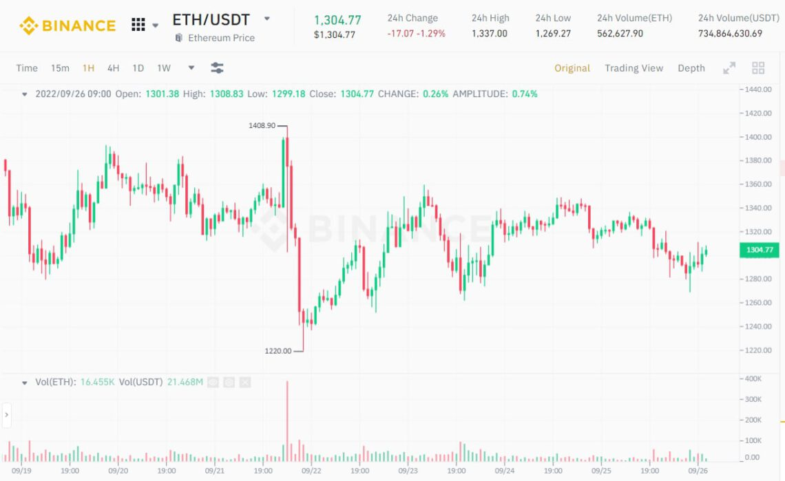 1H Chart of ETH/USDT on Binance at 10:00 AM on 26/09/2022