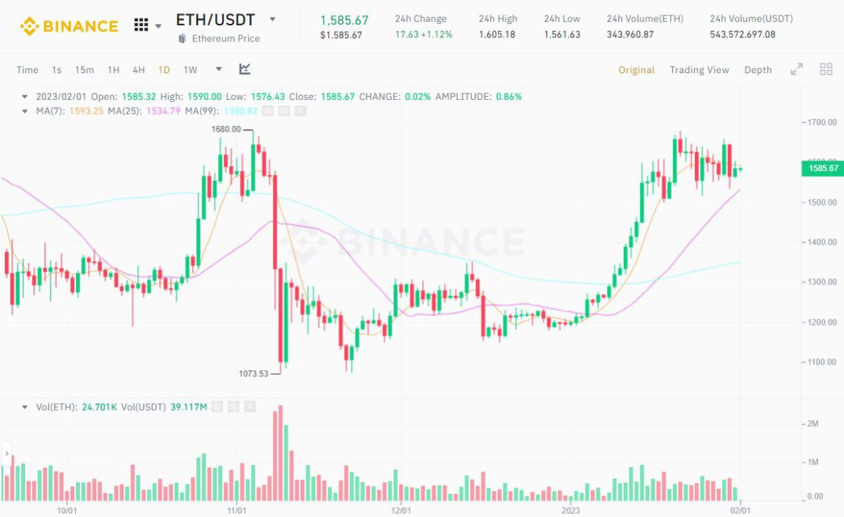 1D Chart of ETH/USDT on Binance as of 8:40 AM, February 1, 2023