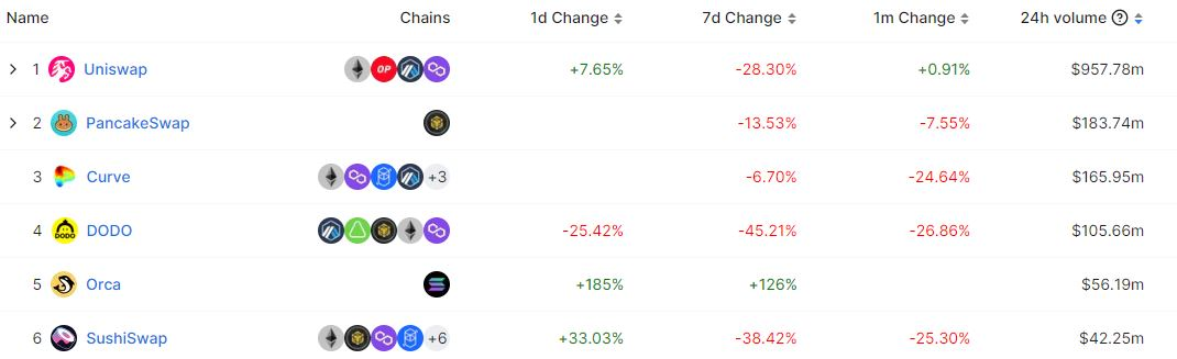Despite this, the road ahead for SushiSwap to restore its position remains challenging. According to DeFi Llama, even though SushiSwap is deployed on 10 blockchains, its 24-hour trading volume stands at $42.25 million—23 times lower than Uniswap’s $957 million, despite Uniswap being available on only 4 blockchains/layer-2s.